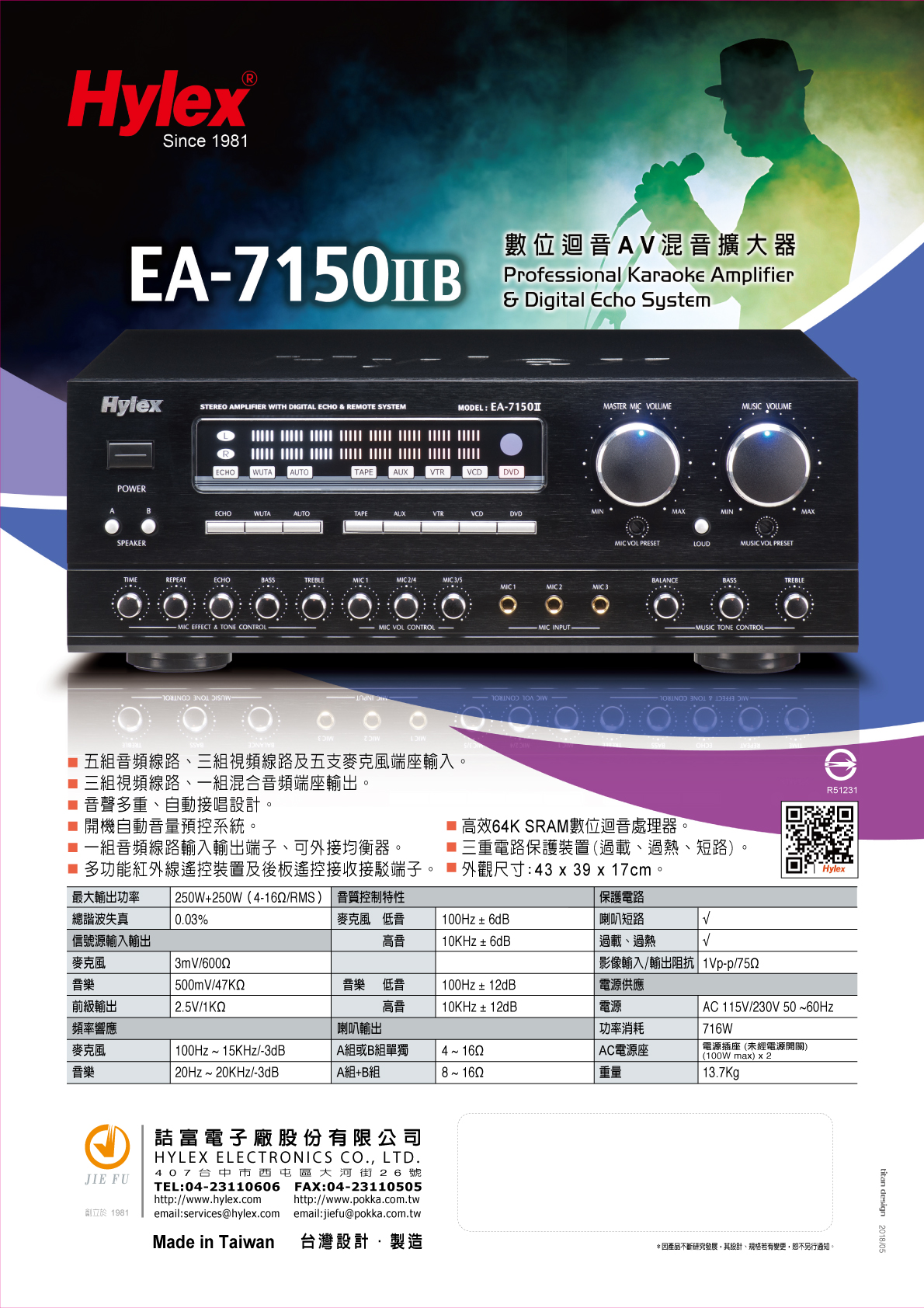EA-7150ⅡB Hylex 數位式迴音AV混音擴大機 / 最大輸出功率250W / 高效64K SRAM數位迴音處理器 /
