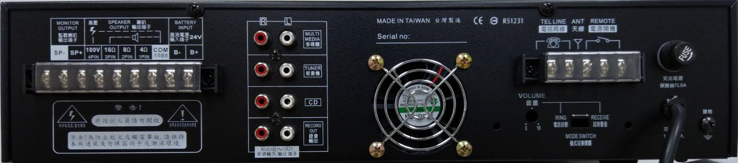 麥克風輸入零敏度-52dB+/-3dB *3, 6.3Φ 輔助輸入零敏度-16dB+/-3dB*1, 6.3Φ 輸入選擇*3(立體3選1)RCA |