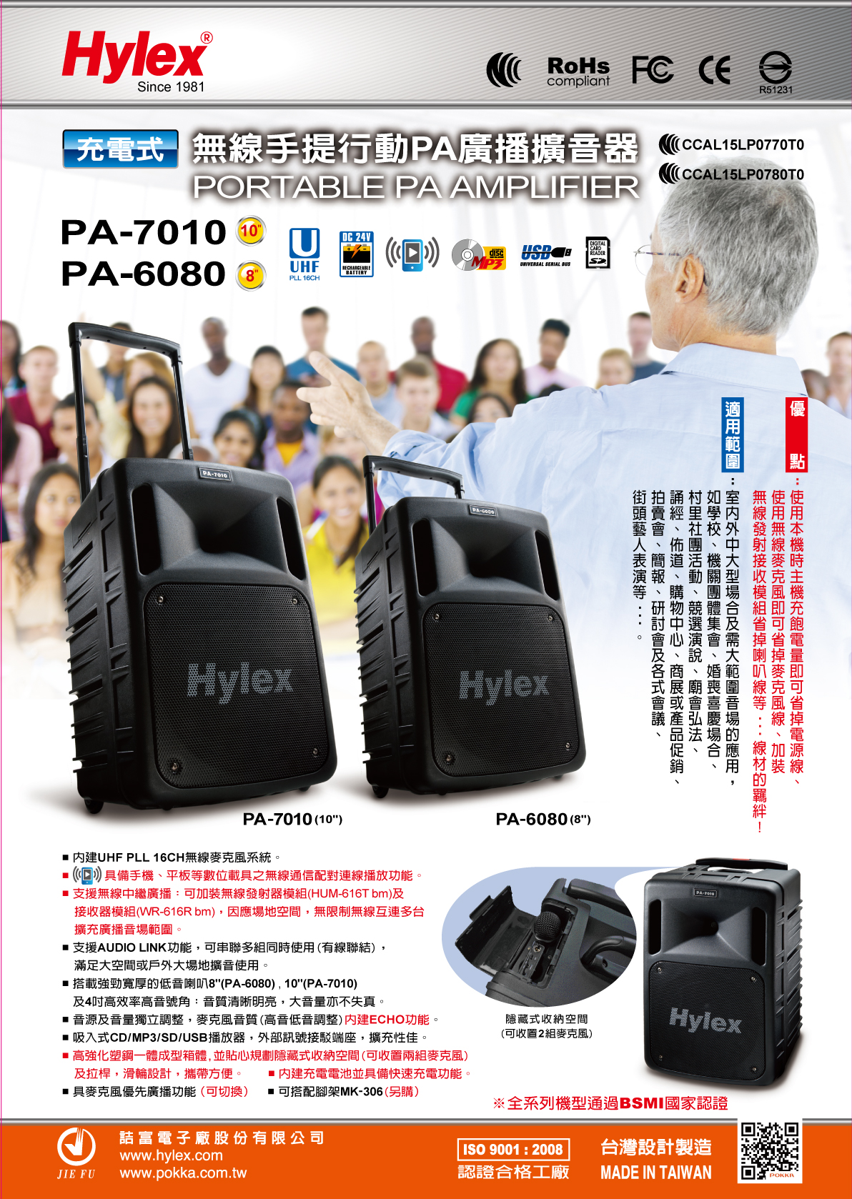 PA-6080DPL/2CH Hylex 200W UHF手提式PA廣播系統 / 雙頻道 / UHF PLL 200頻道選擇 / 最大輸出功率200W / BT,ECHO,USB,SD / 充電式 適用:宗教集會,工廠,學校,機關團體,室內外活動,村里,小型會議 / 一年保固 / 台灣製造