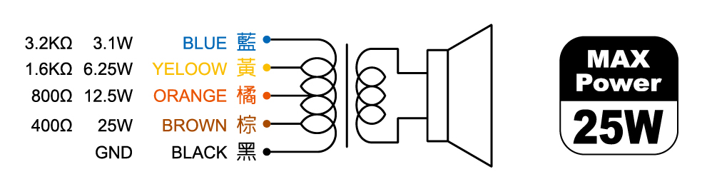 輸入阻抗 100V line:400Ω(25W), 800Ω(12.5W), 1.6KΩ(6.25W), 3.25KΩ(3.1W)