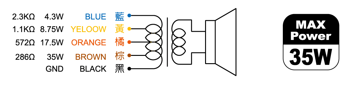 輸入阻抗 100V line:286Ω(35W), 572Ω(17.5W), 1143Ω(8.75W), 2.3KΩ(4.3W)